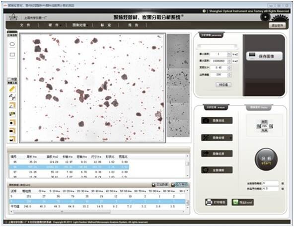 3.  軟件可針對從小到大的顆粒進行分類,并標注出在每個分類段里的顆粒數(shù)量,面積,和百分比等數(shù)據(jù)。