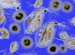 這是斯匹克-沃克爾拍攝的浮游生物顯微照片。拍攝時采用了萊因伯格照明法,憑借有色盤提供的鮮艷色彩,使快速移動的浮游生物在明亮藍色調(diào)下清晰可見。