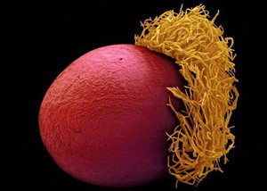 這張顯微照片清晰地捕捉到人工試管受精(IVF)過程。圖中的卵細胞(棕色球體)要比精子細胞大許多,其周圍圍繞著保護積云細胞(圖中黃色部分),卵細胞周圍的薄膜是卵膜,精子頭部攜帶著酶試圖溶解卵膜,從而與卵細胞結(jié)合。