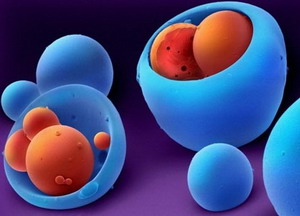 共聚物又稱為共聚體,是由兩種或兩種以上不同單體經(jīng)聚合反應(yīng)而得的聚合物。共聚物可用于制造藥物膠囊,它負責(zé)裝載藥物微粒;聚合物不溶于酸性溶液,因此它們可用于制成藥物涂層,從而避免人體吞服藥物時藥物在胃中溶化,或者通過緩慢消溶聚合物,逐漸釋放藥物效力,減少服藥次數(shù)。如圖所示,圖中橙色部分是藥物膠囊中的內(nèi)部微粒。這種膠囊是脫氫皮質(zhì)醇藥物,用于治療腸炎。外部呈藍色的顆粒是共聚物,負責(zé)裝載這些藥物微粒。