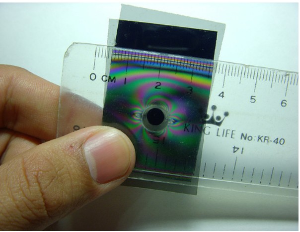 把塑膠尺放在兩片偏光片之間,調(diào)整偏光片的角度,就會(huì)看見(jiàn)塑膠尺上出現(xiàn)特別的花紋。