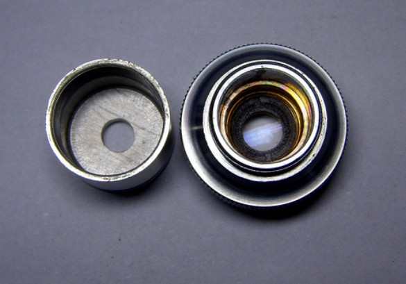 10X的物鏡稍微複雜一點。順帶一提,顯微鏡10X物鏡拆到較后,得到的中間那玩意超棒!可以當(dāng)作高倍的放大鏡來用。只用這個東西,我甚至可以直接靠在吊竹草的葉背,看見氣孔的分佈,或是靠在蕨葉背,看見孢子囊的環(huán)紋。